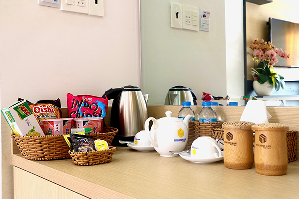 - Trà gói, cafe gói, nước suối miễn phí (330ml)