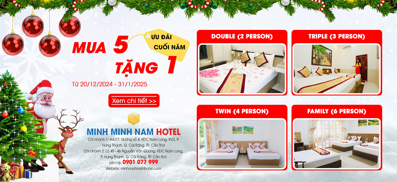 Trong dịp cuối năm 2024, Minh Minh Nam Hotel đồng hành cùng Quý khách hàng với chương trình ưu đãi cuối năm “MUA 5 TẶNG 1” cực kì hấp dẫn dành riêng cho Quý khách hàng là bạn bè, khách hàng, đối tác thân thiết đã luôn đồng hành cùng chúng tôi.